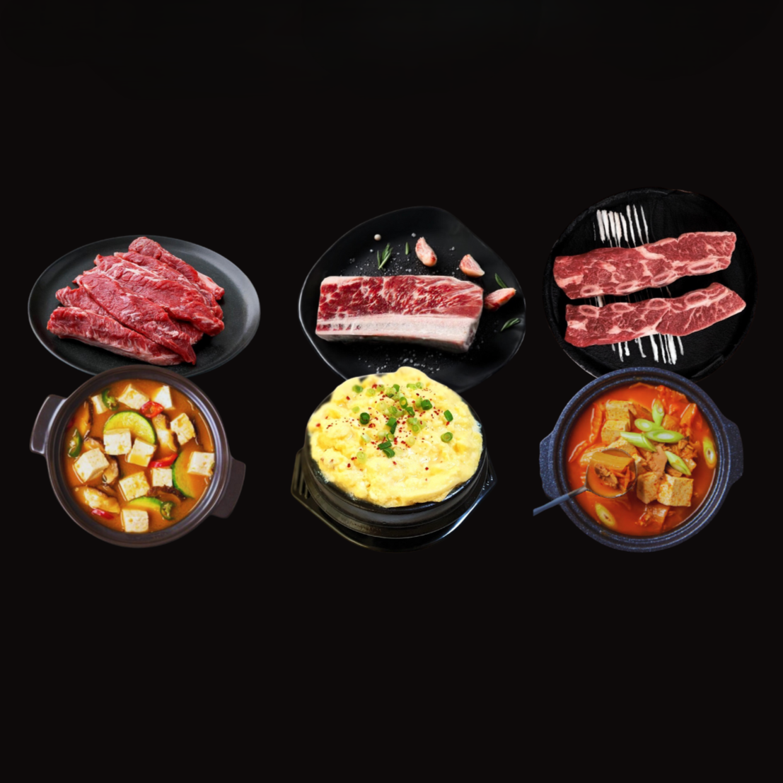Sườn bò không xương (150G), Sườn bò thượng hạng (250G), Sườn bò L.A (200g) 갈비살 (150G), 우대갈비 (250G), L.A갈비 (200G) Trứng hấp, Canh Kim Chi/ Canh tương đậu (chọn 01), 계란찜, 김치찌개/ 된장찌개 택일