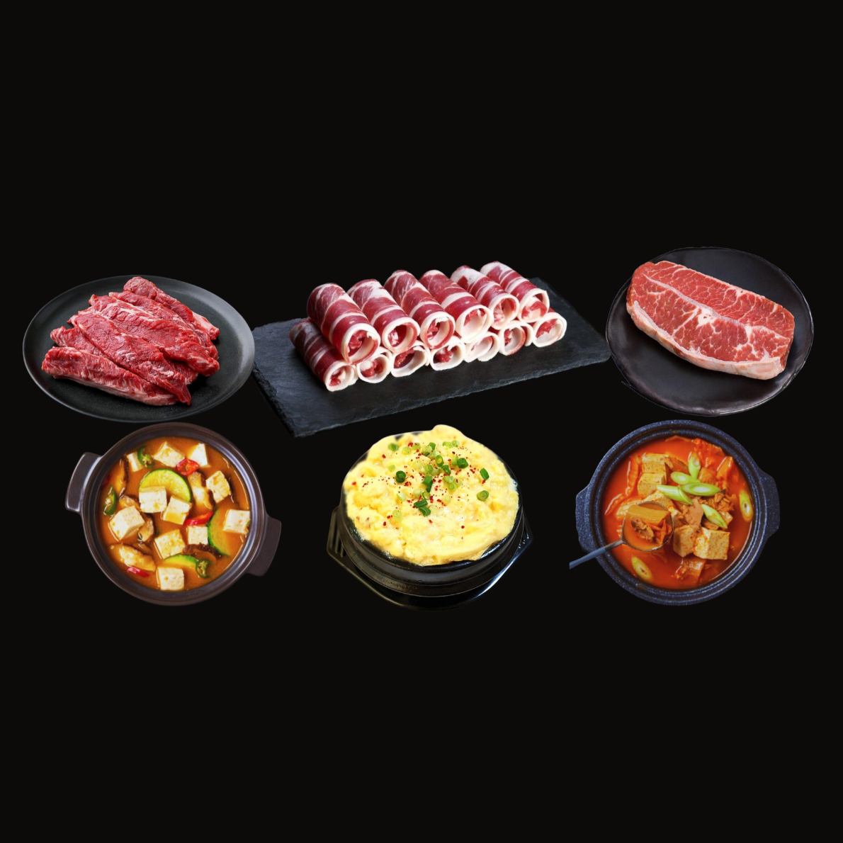 Ba chỉ bò (200g), Sườn bò không xương (150G), Nạc vai bò (150G), 우삼겹 (200G), 갈비살 (150G), 부채살 (150G), Trứng hấp, Canh Kim Chi/ Canh tương đậu (chọn 01), 계란찜, 김치찌개/ 된장찌개 택일
