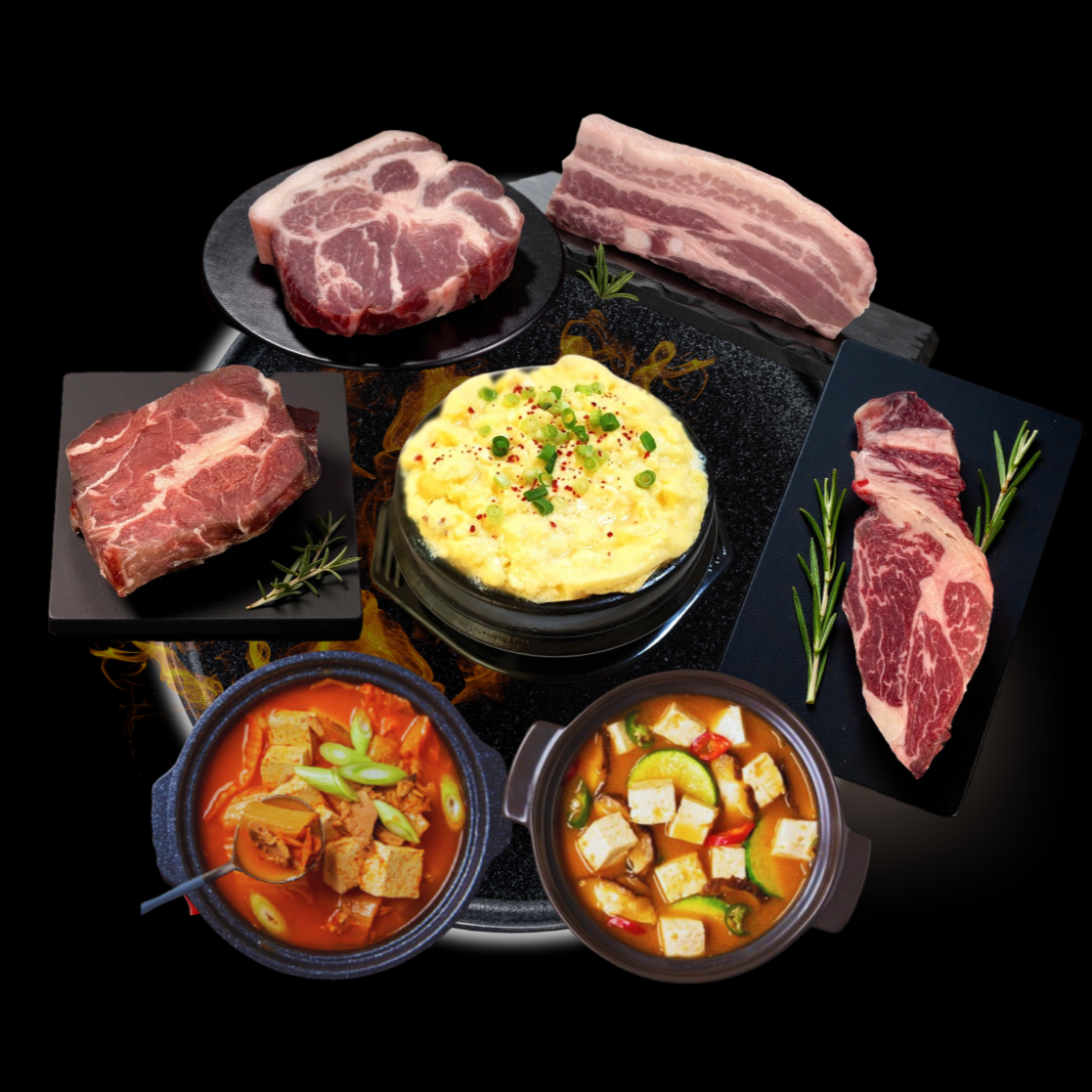 Ba chỉ heo(150G), nạc dăm cổ(150G), nạc vai bò(150G), thăn ngoại bò(150G), 삼겹살 (150G), 목살 (150G), 부채살(150G), 등심 (150G), Trứng hấp, Canh kim chi / Canh tương đậu (Chọn 1), 계란찜, 김치찌개 / 된장찌개 택일