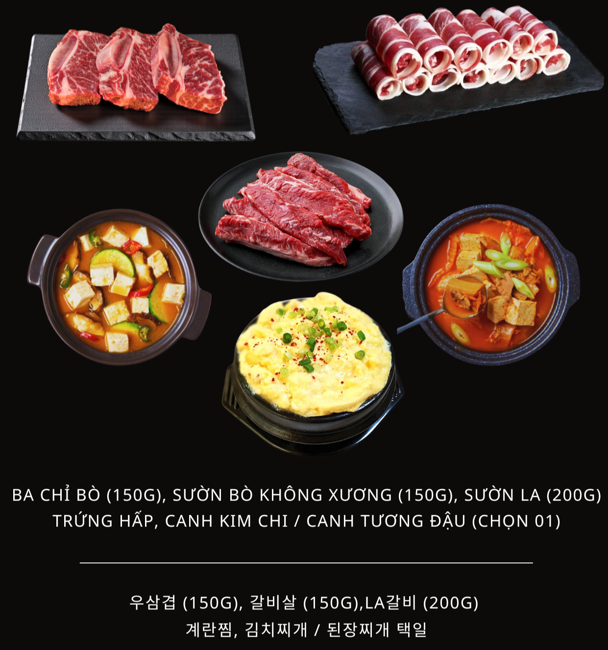 BA CHỈ BÒ (150G), SƯỜN BÒ KHÔNG XƯƠNG (150G), SƯỜN LA (200G) TRỨNG HẤP, CANH KIM CHI / CANH TƯƠNG ĐẬU (CHỌN 01) 우삼겹 (150G), 갈비살 (150G),LA갈비 (200G) 계란찜, 김치찌개 / 된장찌개 택일